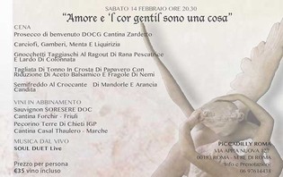 La sera di San Valentino a Roma, il Piccadilly vuole rispettare la tradizione, anzi trasformare quella che ormai purtroppo sembra essere diventata solo una festa commerciale, in un'Apericena - degustazione accompagnata dalla Live Performance dei Soul Duet.